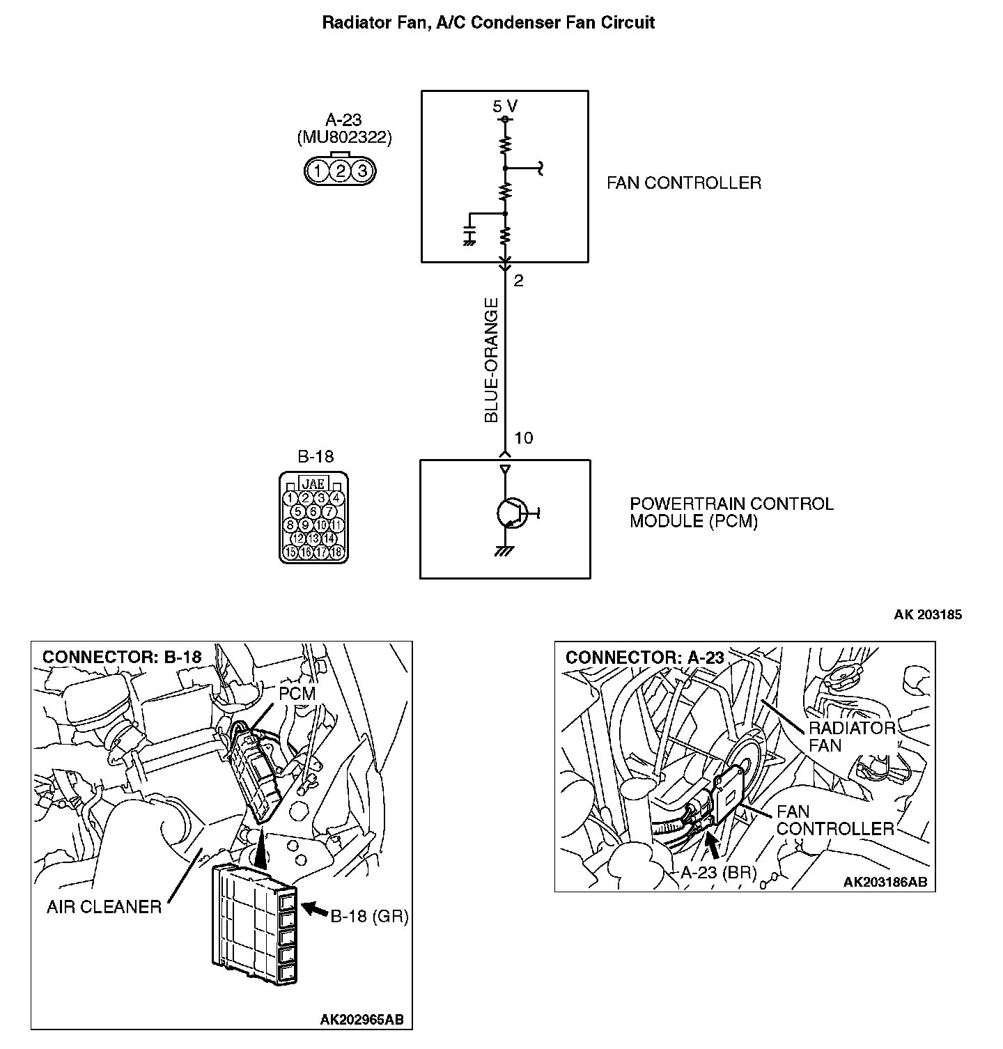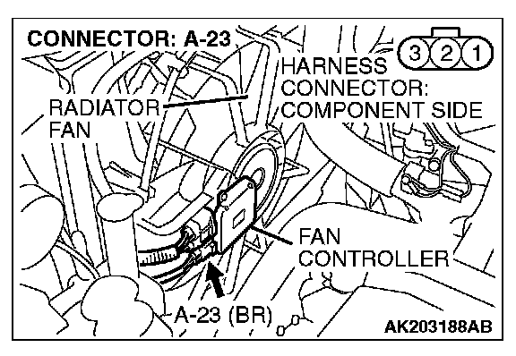 STEP 3. Check for open circuit and short circuit to ground and harness damage between fan controller A-23 (terminal No. 2) and PCM connector B-18 (terminal No. 10).