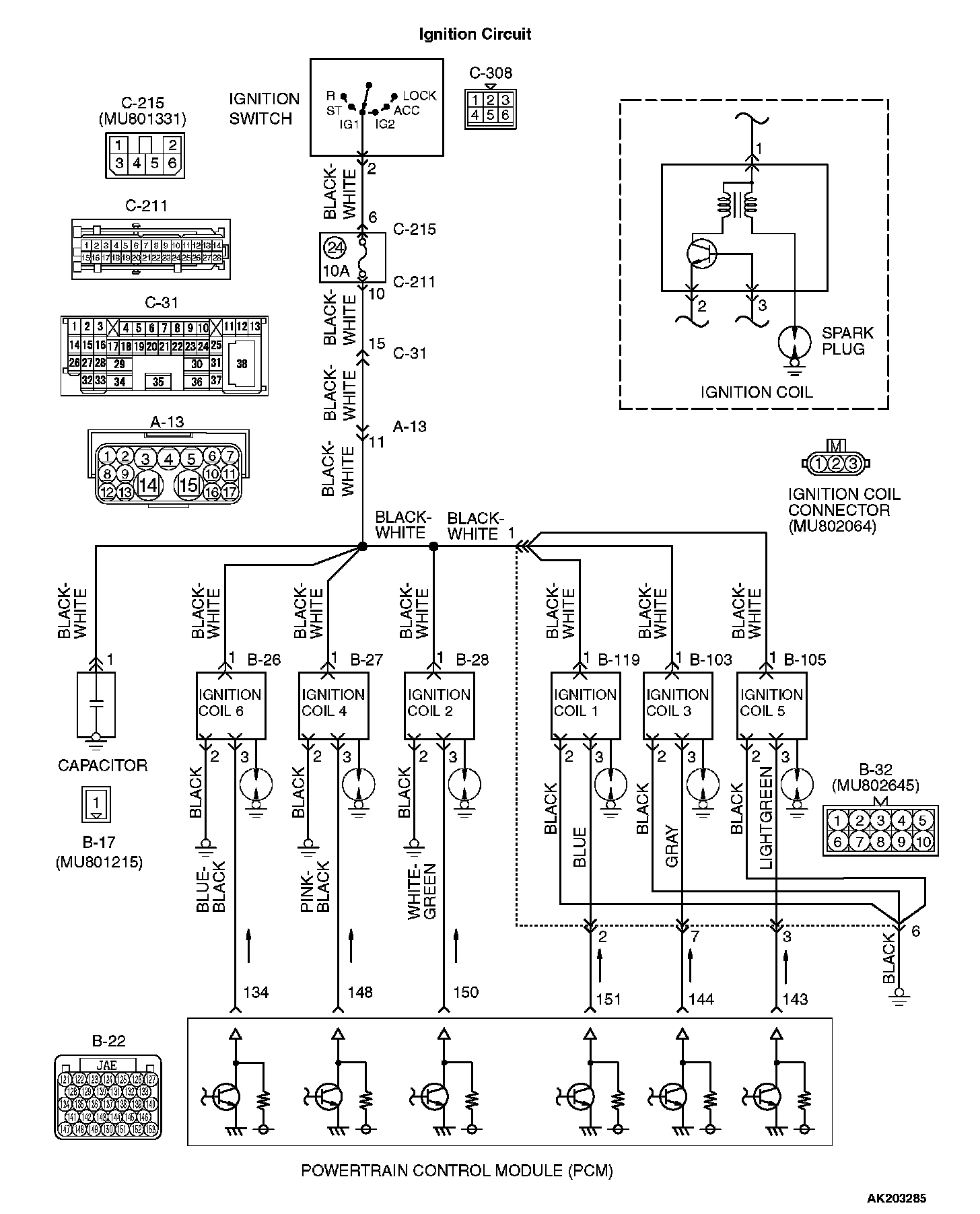 - When the PCM turns off its internal power transistor, battery positive voltage is applied to the ignition power transistor (terminal No. 3) inside the ignition coil, causing the ignition power transistor to be turned on.