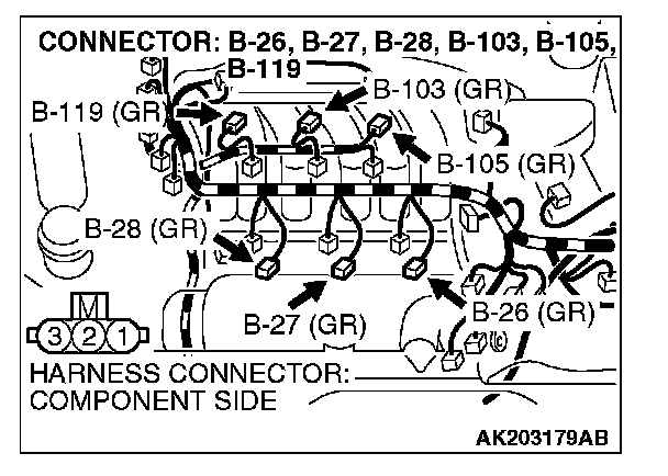 STEP 11. Check harness connector B-101 or B-104 or B-118 at right bank injector for damage.