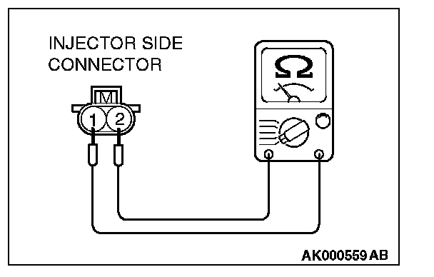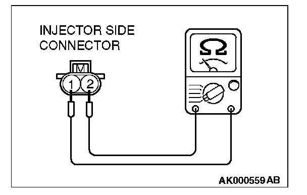 3. Measure the resistance between injector side connector terminal No. 1 and No. 2.