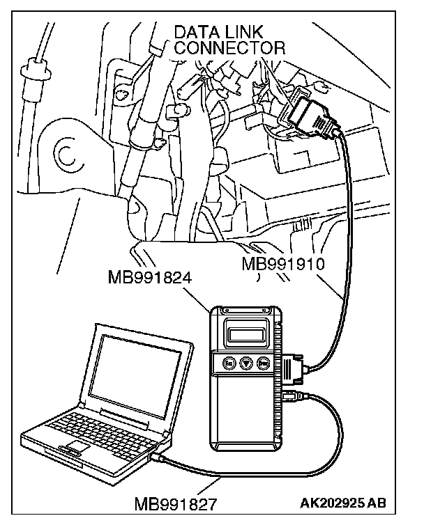 CAUTION: To prevent damage to scan tool MB991958, always turn the ignition switch to the "LOCK" (OFF) position before connecting or disconnecting scan tool MB991958.