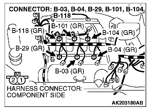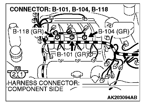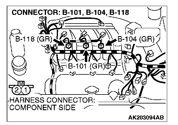 STEP 10. Check harness connector B-101 or B-104 or B-118 at right bank injector for damage.