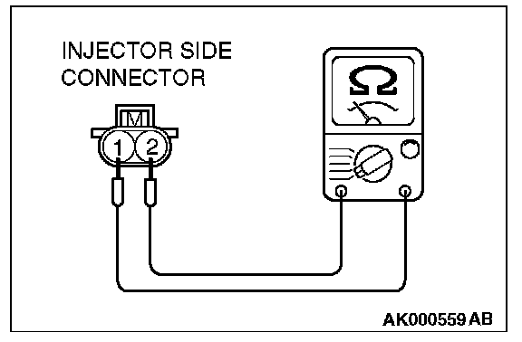 3. Measure the resistance between injector side connector terminal No. 1 and No. 2.