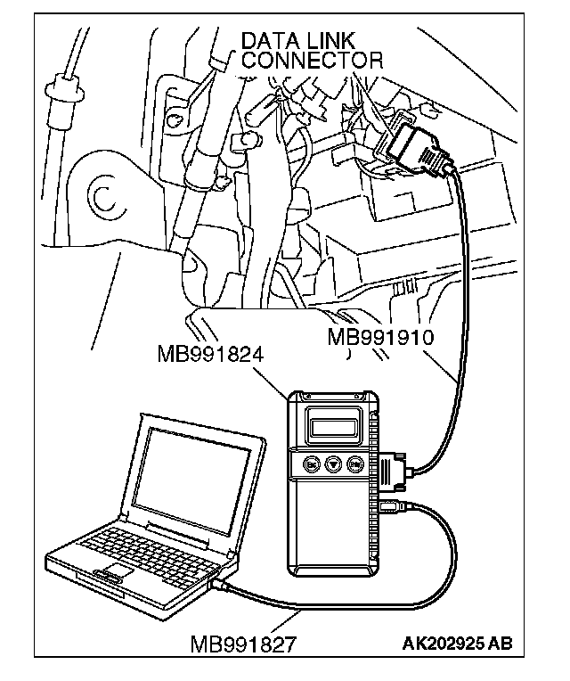 CAUTION: To prevent damage to scan tool MB991958, always turn the ignition switch to "LOCK" (OFF) position before connecting or disconnecting scan tool MB991958.