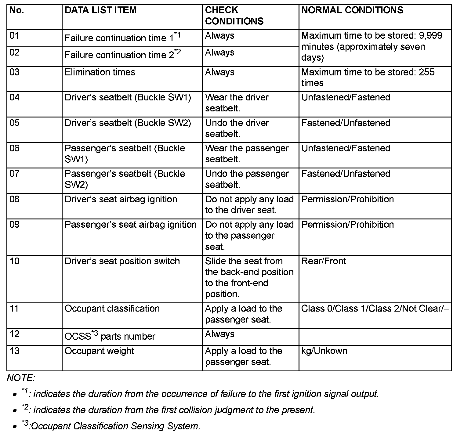 The given items can be read by the scan tool from the ABS-ECU input data. The following items can be read by the scan tool from the SRS-ECU input data.