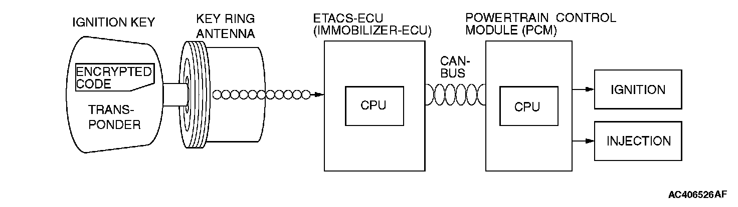 The engine immobilizer system prevents the engine from starting and immobilizes the vehicle if a key other than the key registered for that vehicle is used in an attempt to start the engine after forced entry. The engine immobilizer system consists of the ignition key, the key ring antenna, the ETACS-ECU (immobilizer-ECU), and the powertrain control module (PCM). It has these functions: