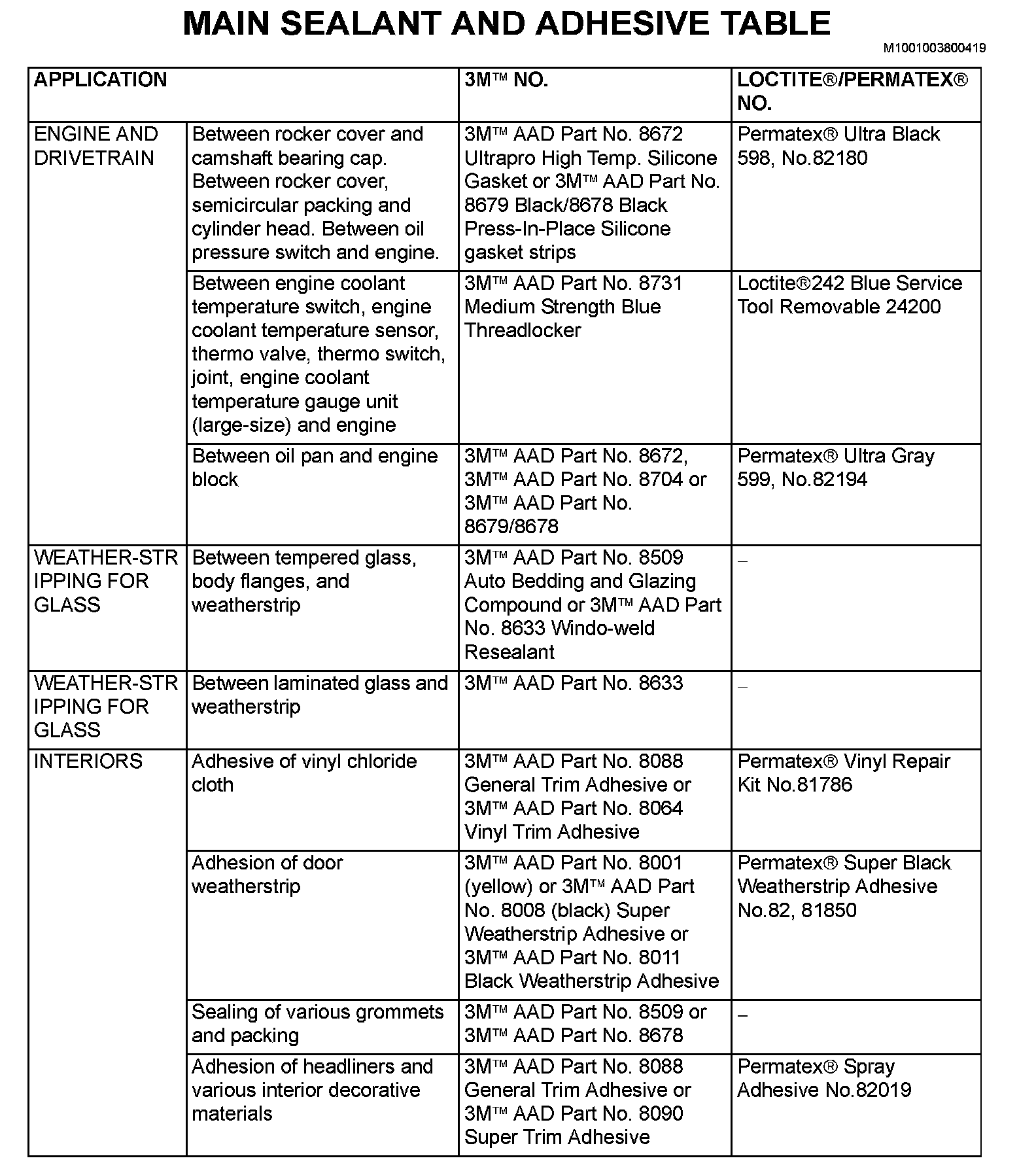 MAIN SEALANT AND ADHESIVE TABLE