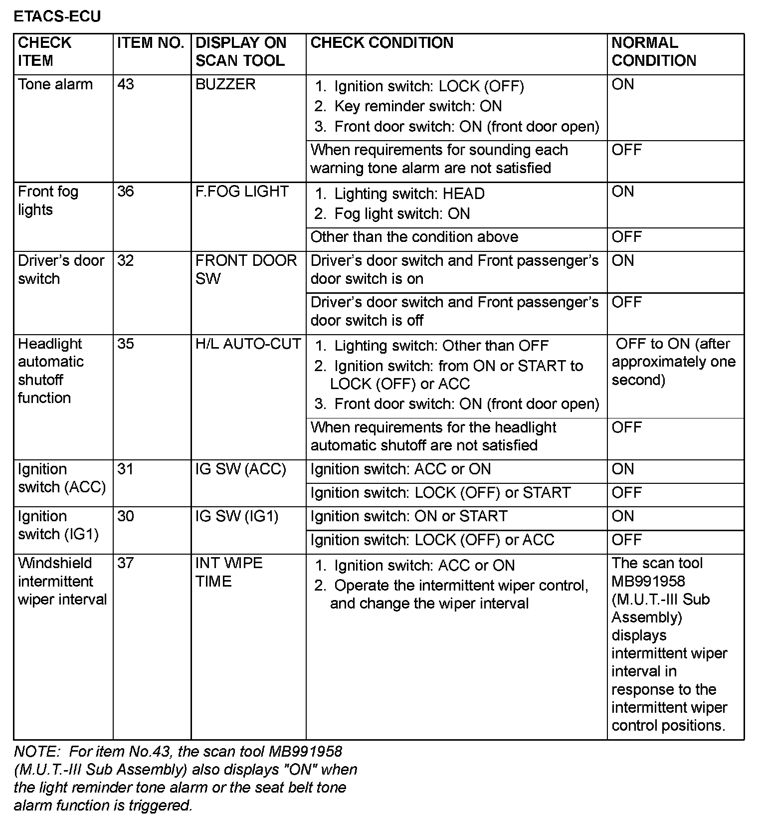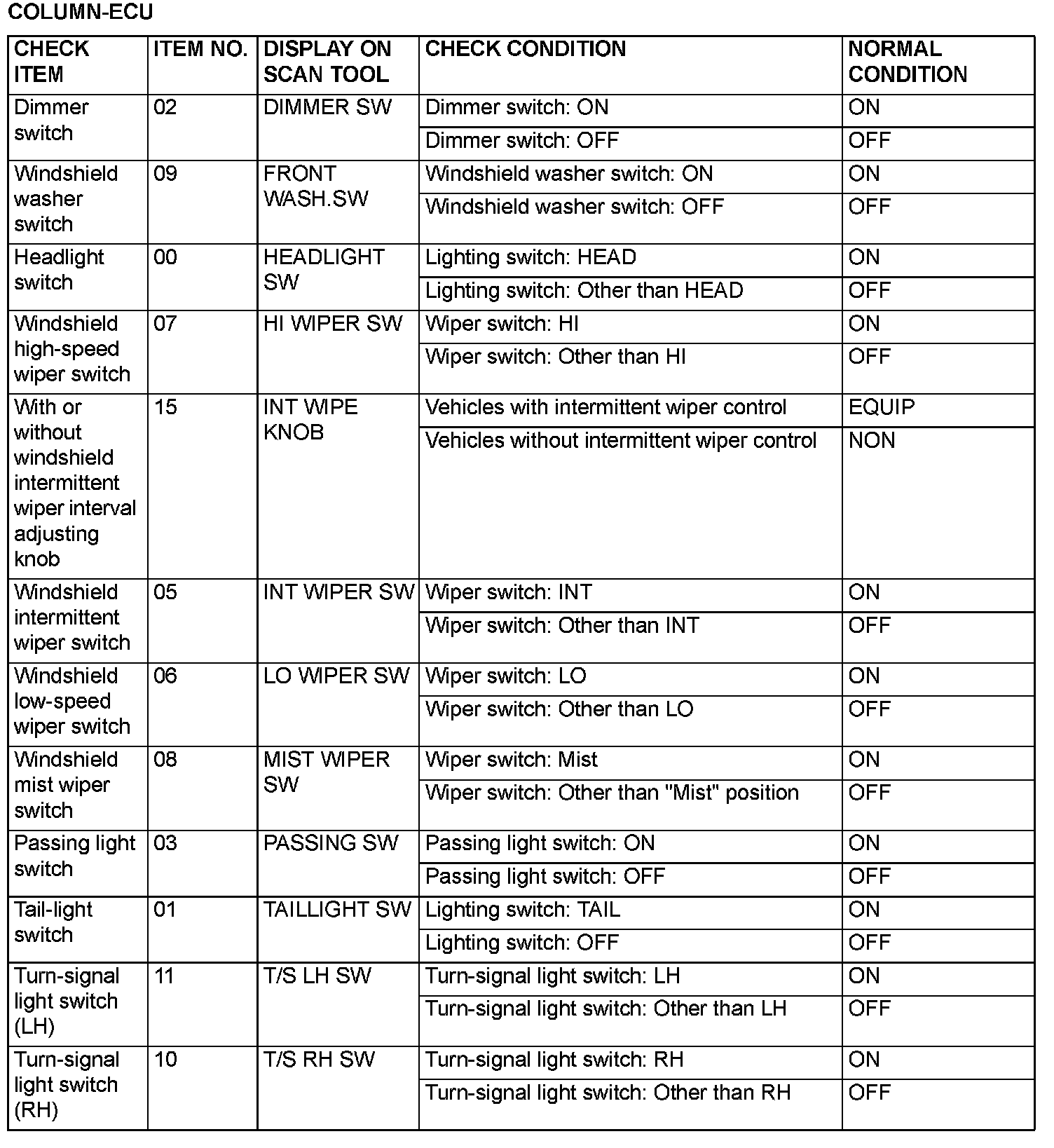 The table shows the service data and their normal condition, which are displayed during the "Data List".