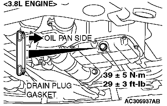 3. Install a new drain plug gasket so that it faces in the direction shown in the illustration, and then tighten the drain plug to the specified torque.