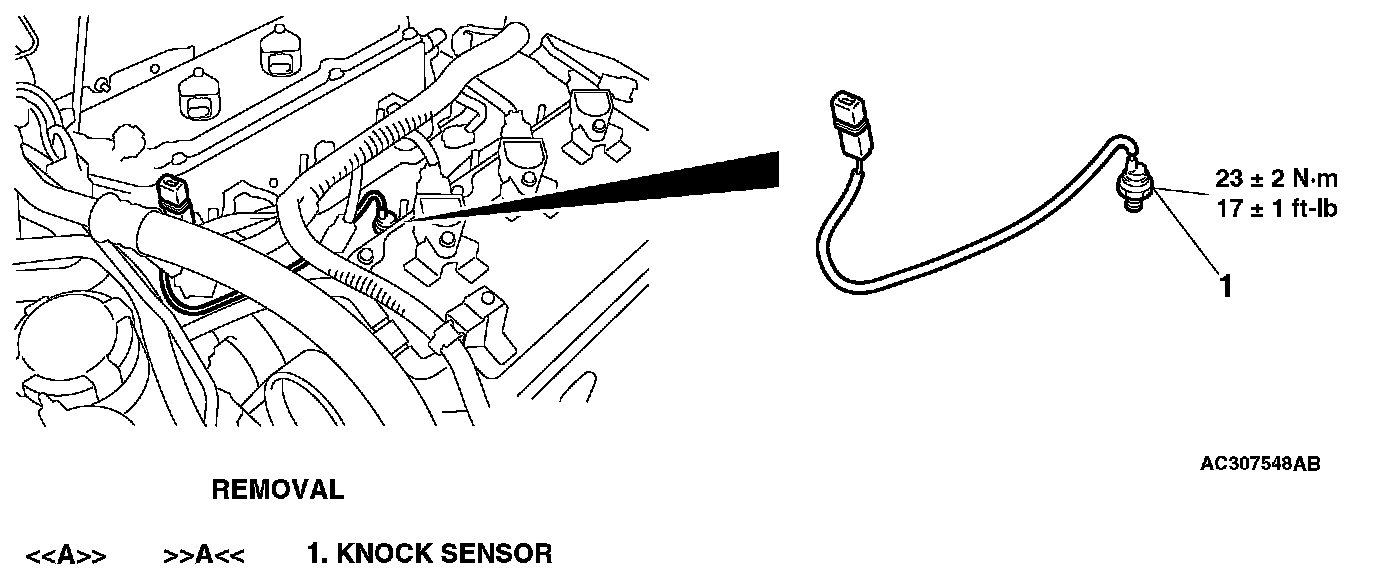 CAUTION: When the knock sensor replacement is performed, use scan tool MB991958 to initialize the learning value (Refer to Initialization Procedure for Learning Value in MFI Engine).