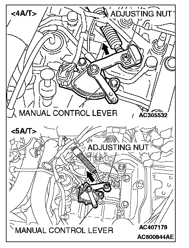 3. Gently push the transaxle control cable in the direction of the arrow, and then tighten the adjusting nut.