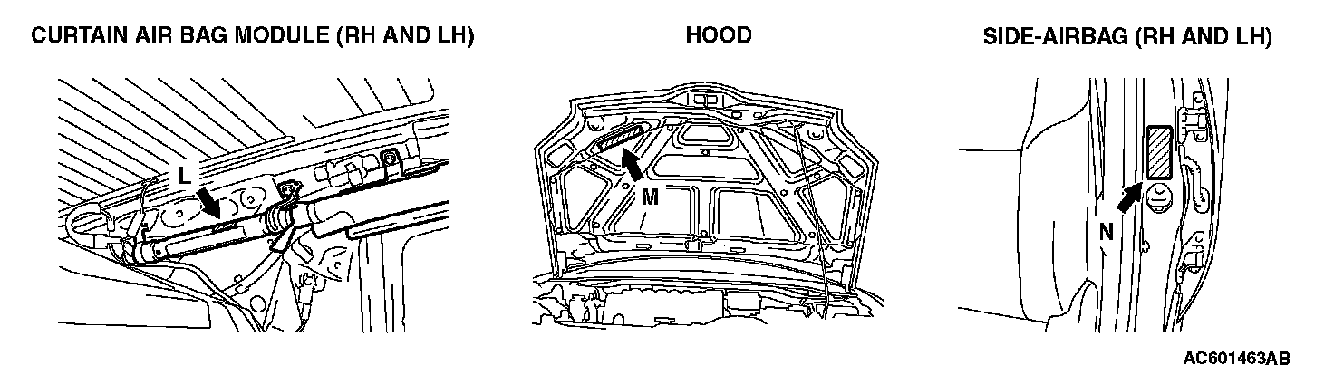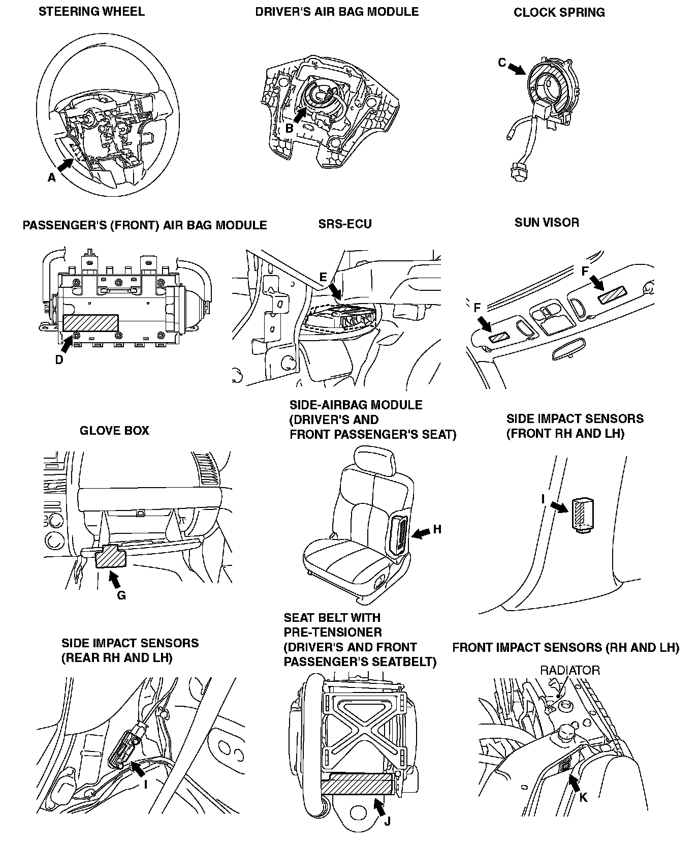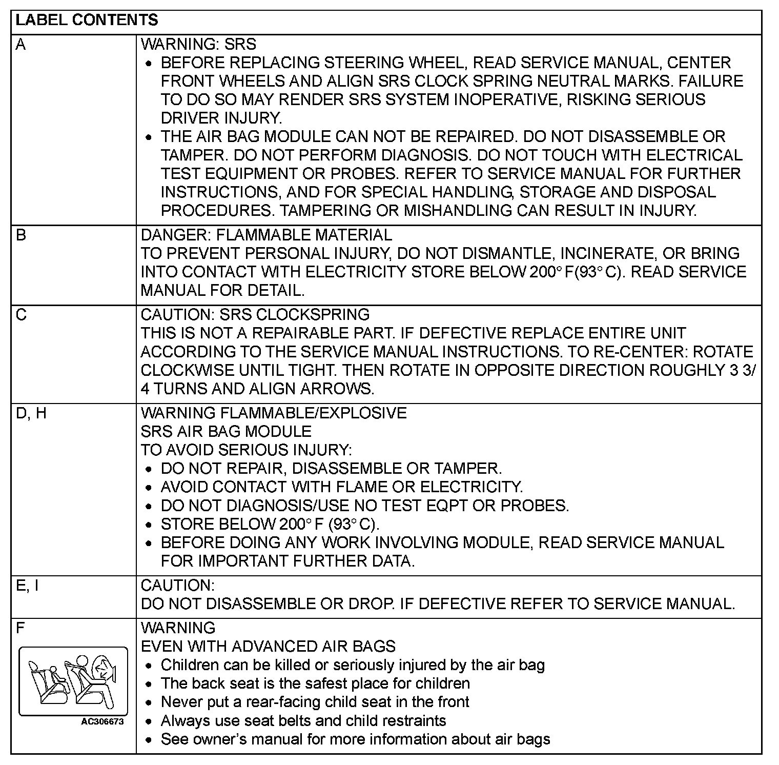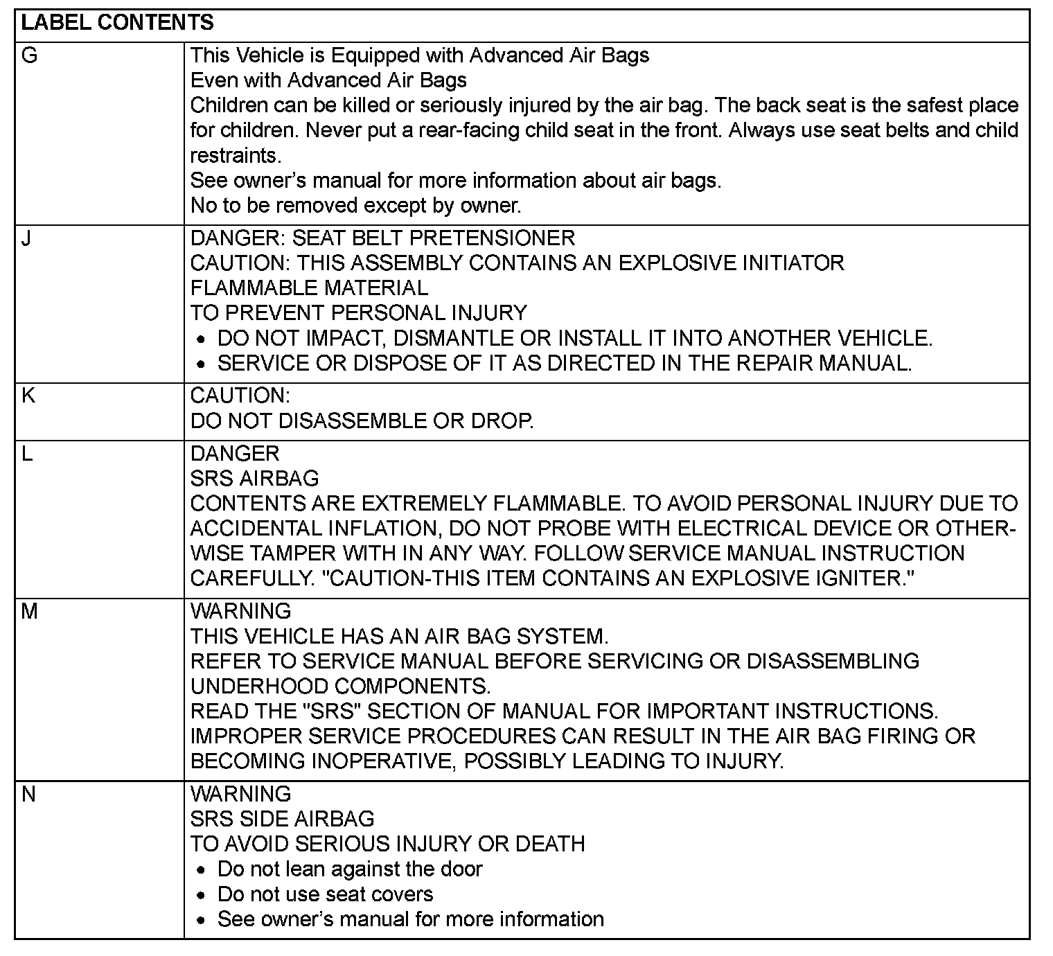 A number of caution labels related to the SRS are found in the vehicle, as shown in the illustrations. Follow label instructions when servicing SRS. If the other labels are dirty or damaged, replace them.