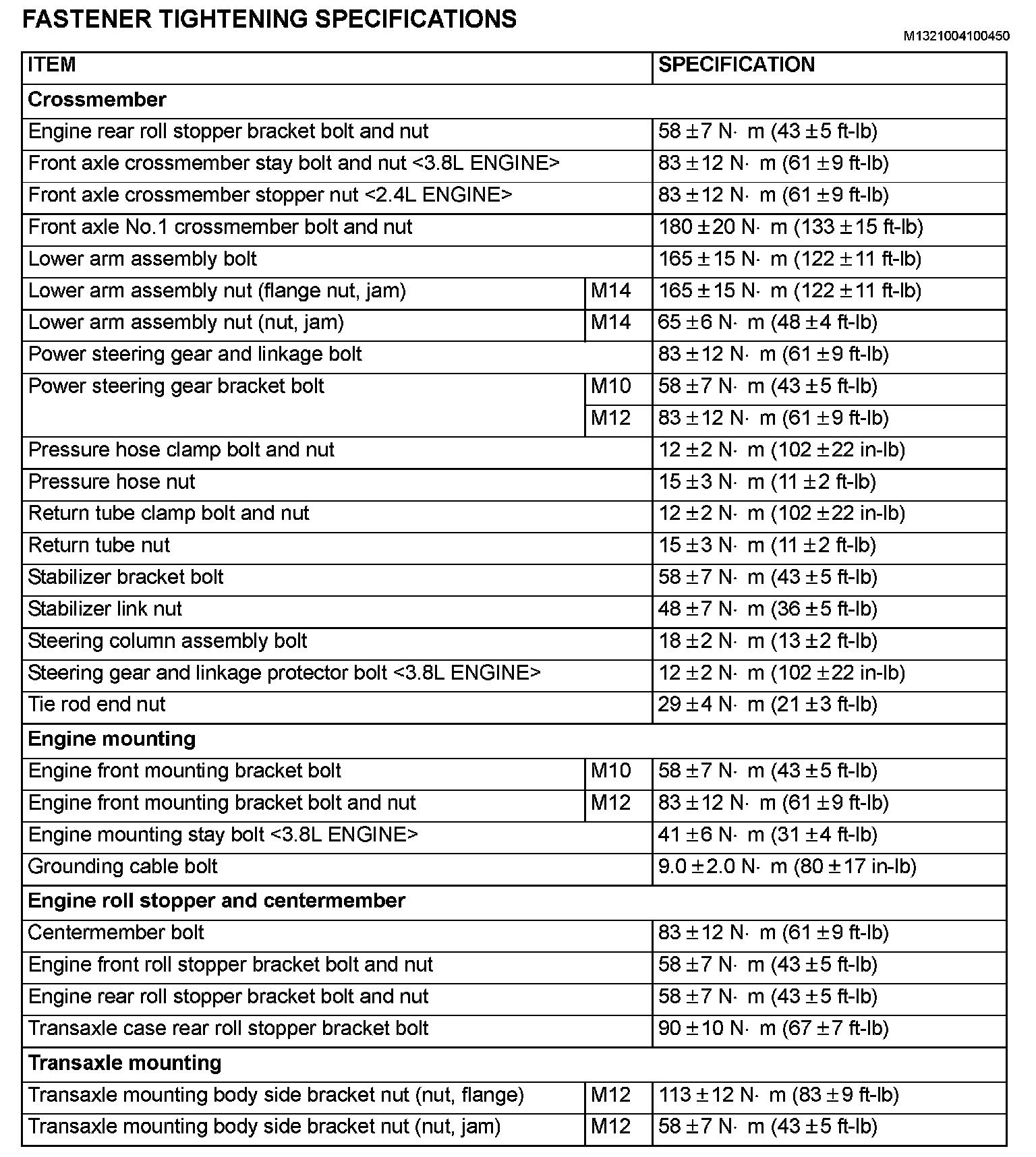 FASTENER TIGHTENING SPECIFICATIONS: