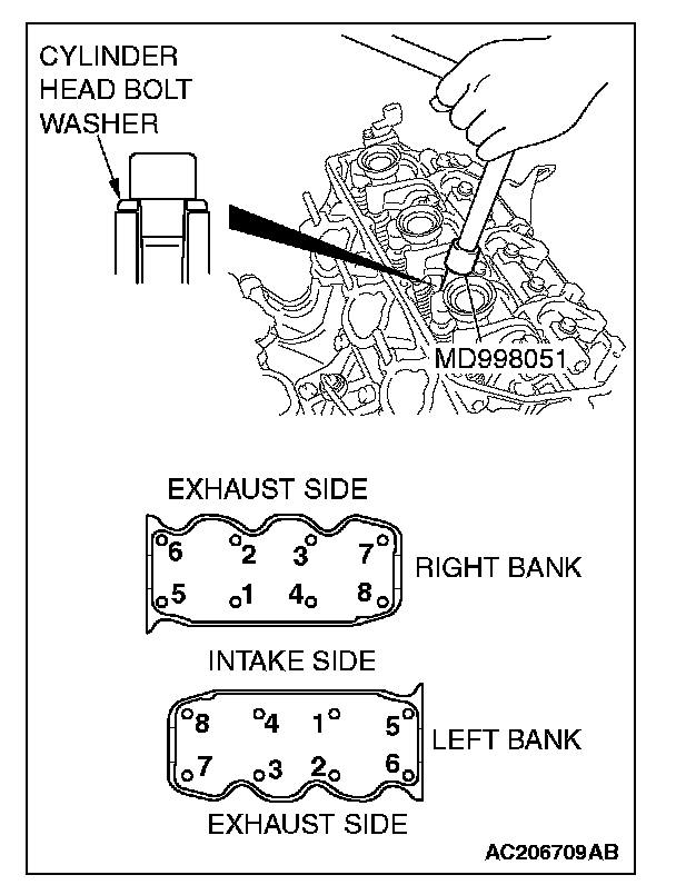 CAUTION: Install the head bolt washers with the beveled side facing upwards as shown in the illustration.