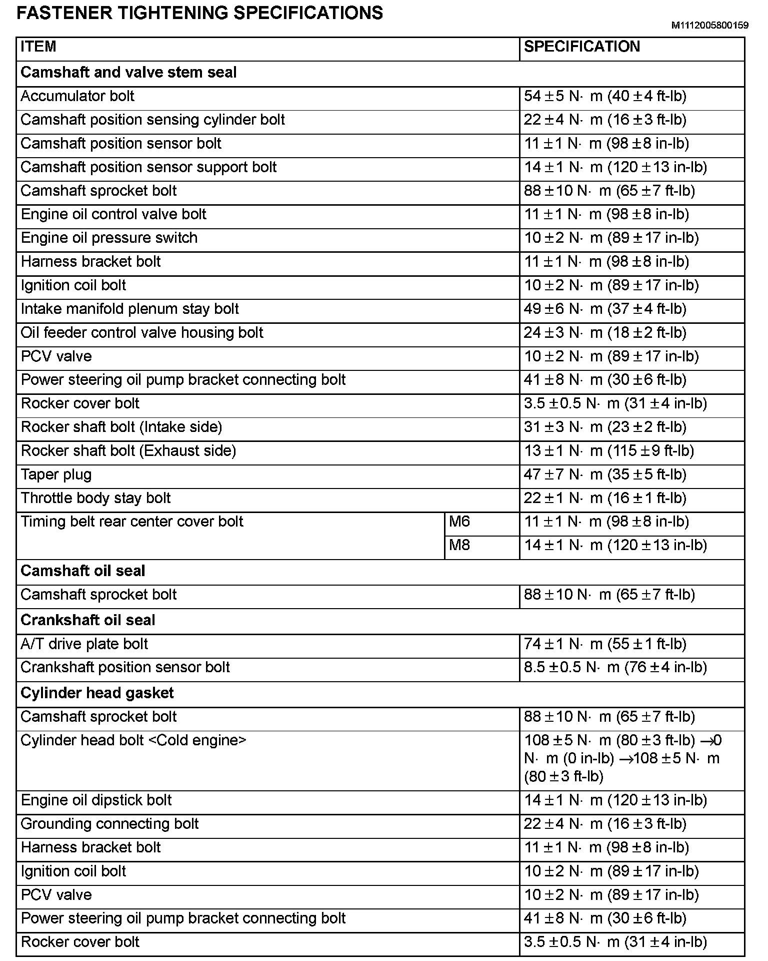 Crankshaft Main Bearing Cap Bolts 74 ± 4 Nm (54 ± 3 ft-lb)