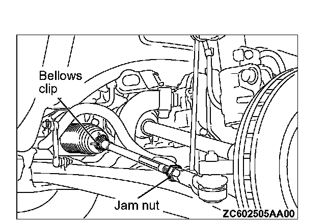 1. Adjust the toe-in by undoing the clip and jam nut, and turning the left and right tie rod turnbuckles by the same amount (in opposite directions).