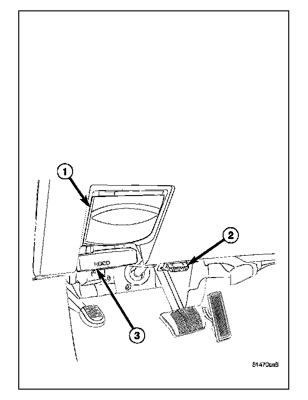 The Data Link Connector (DLC) (2) is a 16-way molded plastic connector insulator on a dedicated take out of the instrument panel wire harness. This connector is located at the lower edge of the instrument panel, outboard of the steering column. The connector insulator is retained by integral snap features within a rectangular cutout in the stamped metal lower instrument panel reinforcement, just below the lower edge of the instrument panel steering column opening cover and inboard of the park brake release (1) and inside hood release (3) handles.