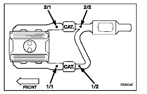 Refer to graphic for typical O2S (oxygen sensor) locations if equipped with two oxygen sensors.