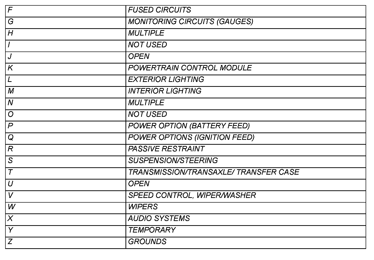 All circuits in the diagrams use an alpha/numeric code to identify the wire and it's function. To identify which circuit code applies to a system, refer to the Circuit Identification Code Chart. This chart shows the main circuits only and does not show the secondary codes that may apply to some models.