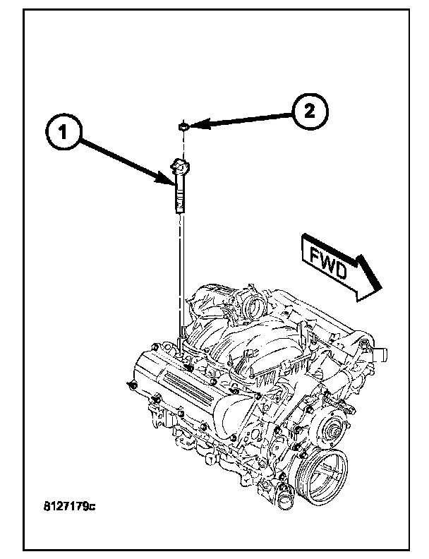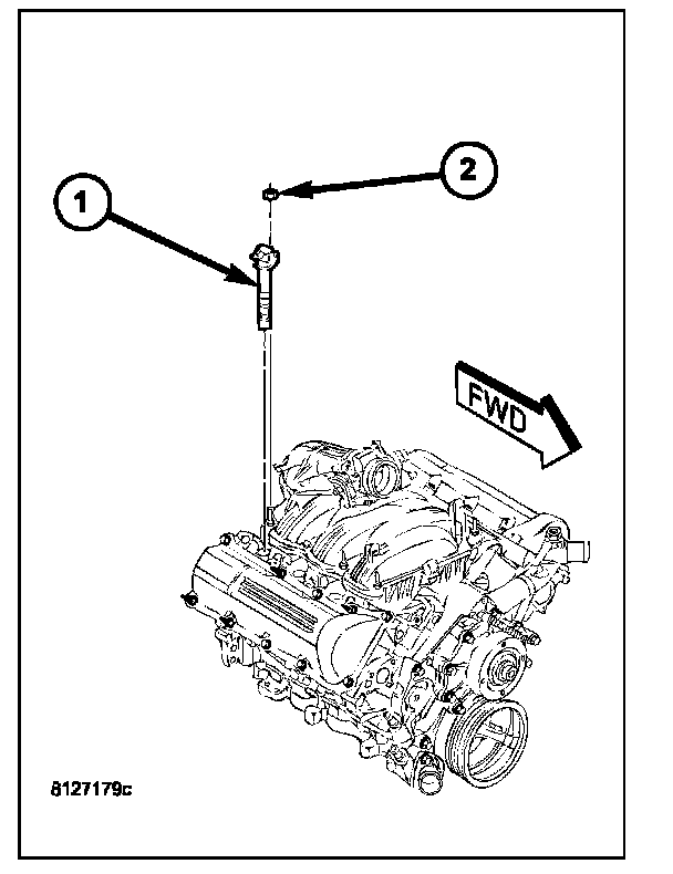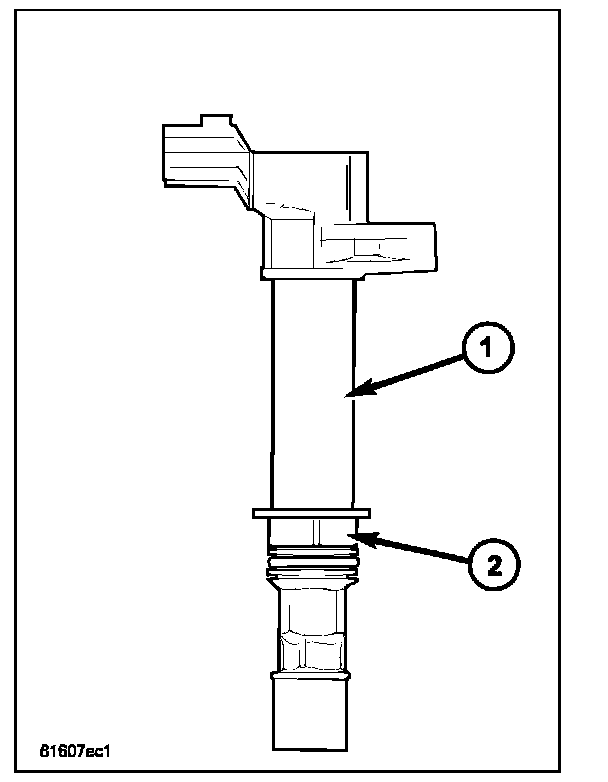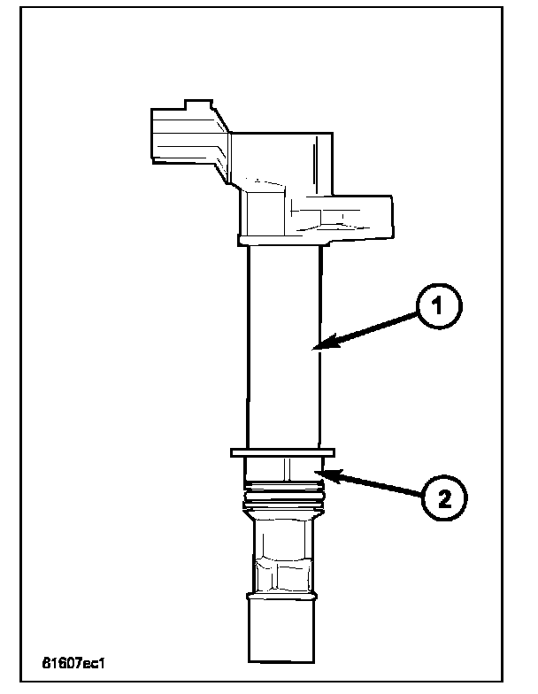 REMOVALAn individual ignition coil (1) is used for each spark plug. The coil fits into machined holes in the cylinder head. A mounting stud/nut secures each coil to the top of the intake manifold. The bottom of the coil is equipped with a rubber boot to seal the spark plug to the coil. Inside each rubber boot is a spring. The spring is used for a mechanical contact between the coil and the top of the spark plug. These rubber boots and springs are a permanent part of the coil and are not serviced separately. An O-ring (2) is used to seal the coil at the opening into the cylinder head.