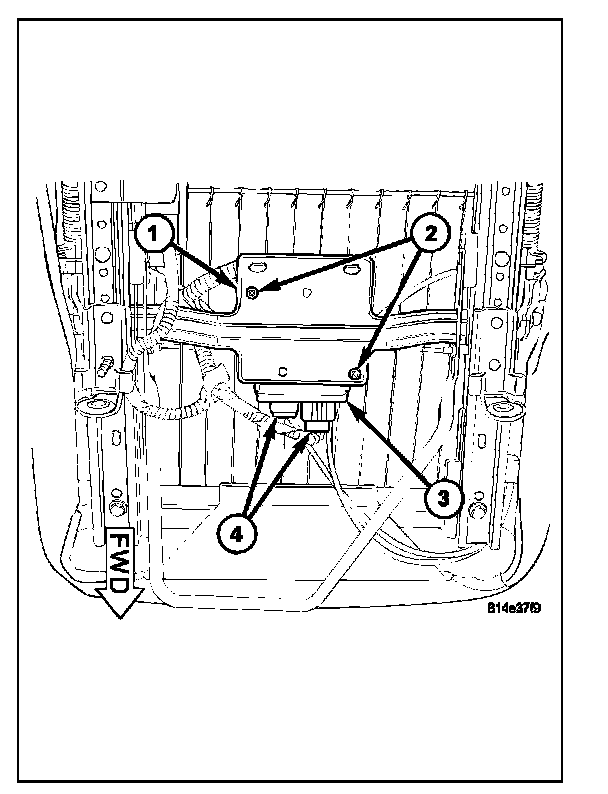2. Reach under the front edge of the passenger side front seat cushion to access and disconnect the body wire harness and seat wire harness connectors from the Occupant Classification Module (OCM) connector receptacles (4) located on the forward facing end of the module.