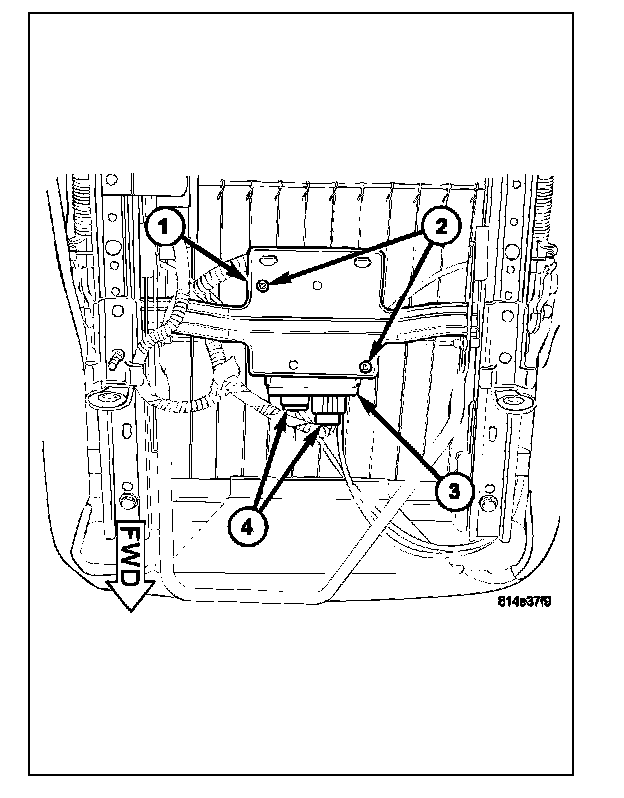 3. Reconnect the body wire harness and seat wire harness connectors to the OCM connector receptacles (4) located on the forward facing end of the module. Be certain that the latches and locks on both connectors are each fully engaged.