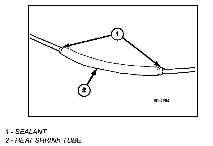 6. Center the heat shrink tubing (2) over the joint and heat using a heat gun. Heat the joint until the tubing is tightly sealed and sealant (1) comes out of both ends of the tubing.