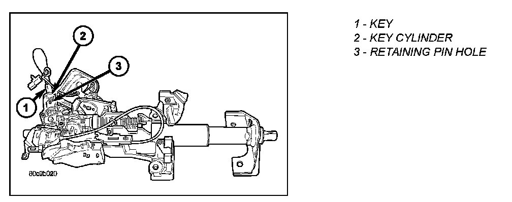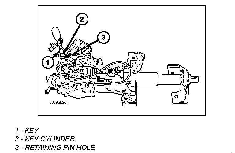 2. Press in on retaining pin while pulling key cylinder (1) from ignition switch.