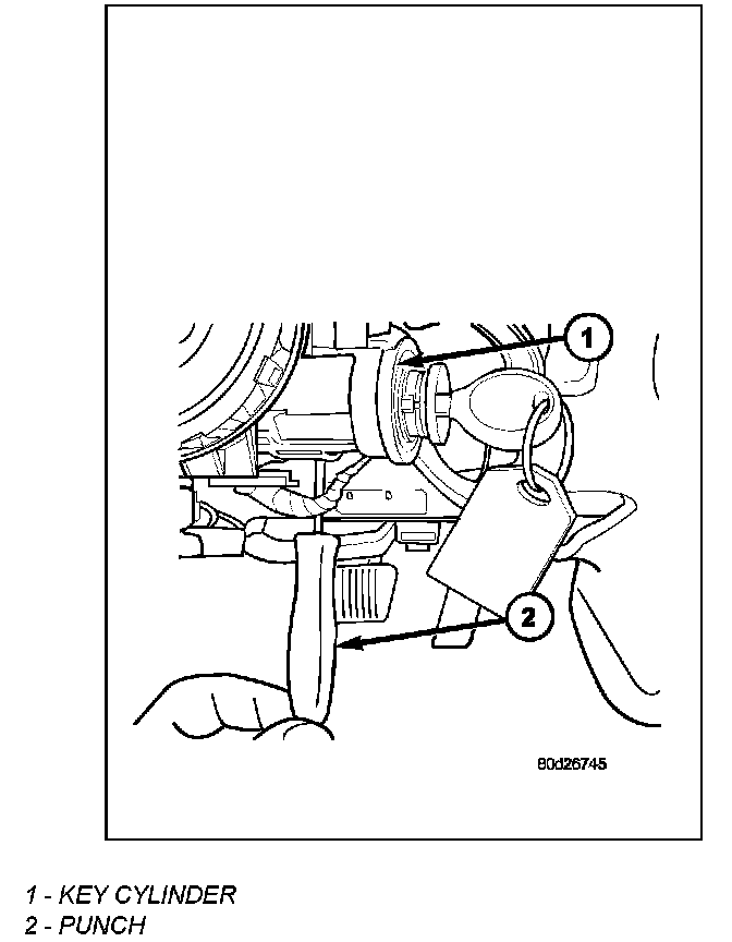 The ignition key (1) must be in the key cylinder (2) for cylinder removal.