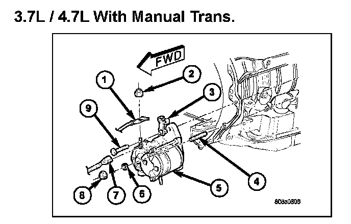 4. Remove one bolt (9) and one nut (8) if equipped with a manual transmission.
