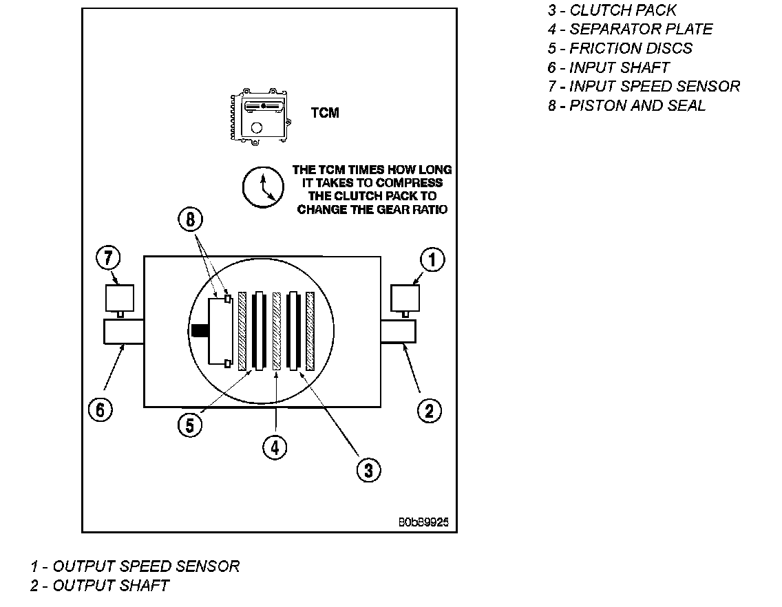 An important function of the TCM is to monitor Clutch Volume Indexes (CVI). CVIs represent the volume of fluid needed to compress a clutch pack. The TCM monitors gear ratio changes by monitoring the Input and Output Speed Sensors. The Input, or Turbine Speed Sensor sends an electrical signal to the TCM that represents input shaft rpm. The Output Speed Sensor provides the TCM with output shaft speed information.