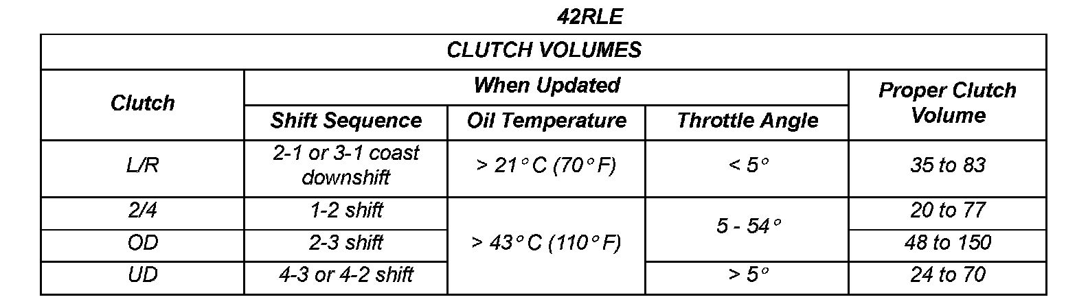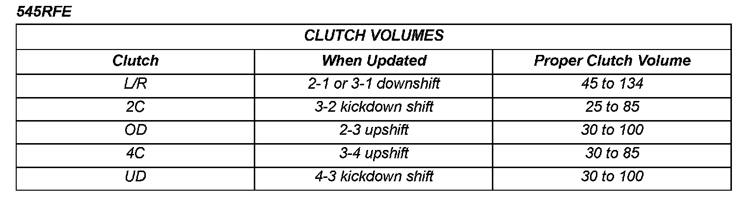 The volume of transmission fluid needed to apply the friction elements are continuously updated for adaptive controls. As friction material wears, the volume of fluid need to apply the element increases. Certain mechanical problems within the input clutch assembly can cause inadequate or out-of-range element volumes. Also, defective Input/Output Speed Sensors and wiring can cause these conditions. The following charts identifies the appropriate clutch volumes and when they are monitored/updated: