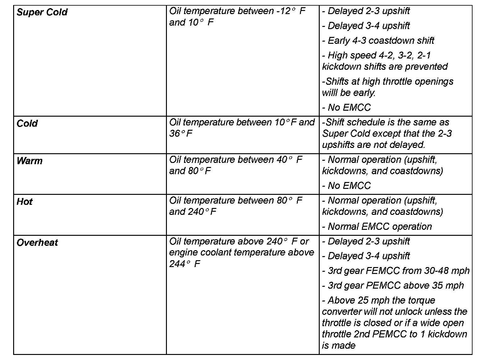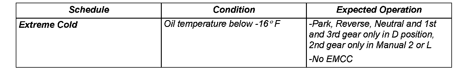 As driving conditions change, the TCM appropriately adjusts the shift schedule. Refer to the following chart to determine the appropriate operation expected, depending on driving conditions.