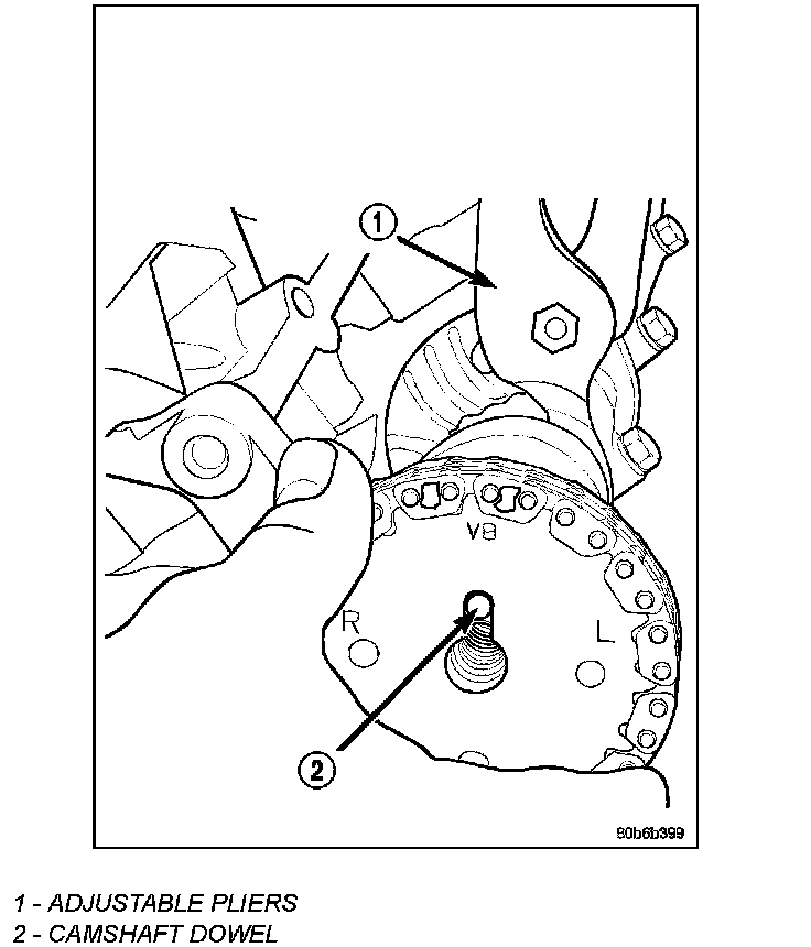5. Using a suitable pair of adjustable pliers (1), rotate the camshaft until the alignment dowel (2) on the camshaft is aligned with the slot in the camshaft drive gear.