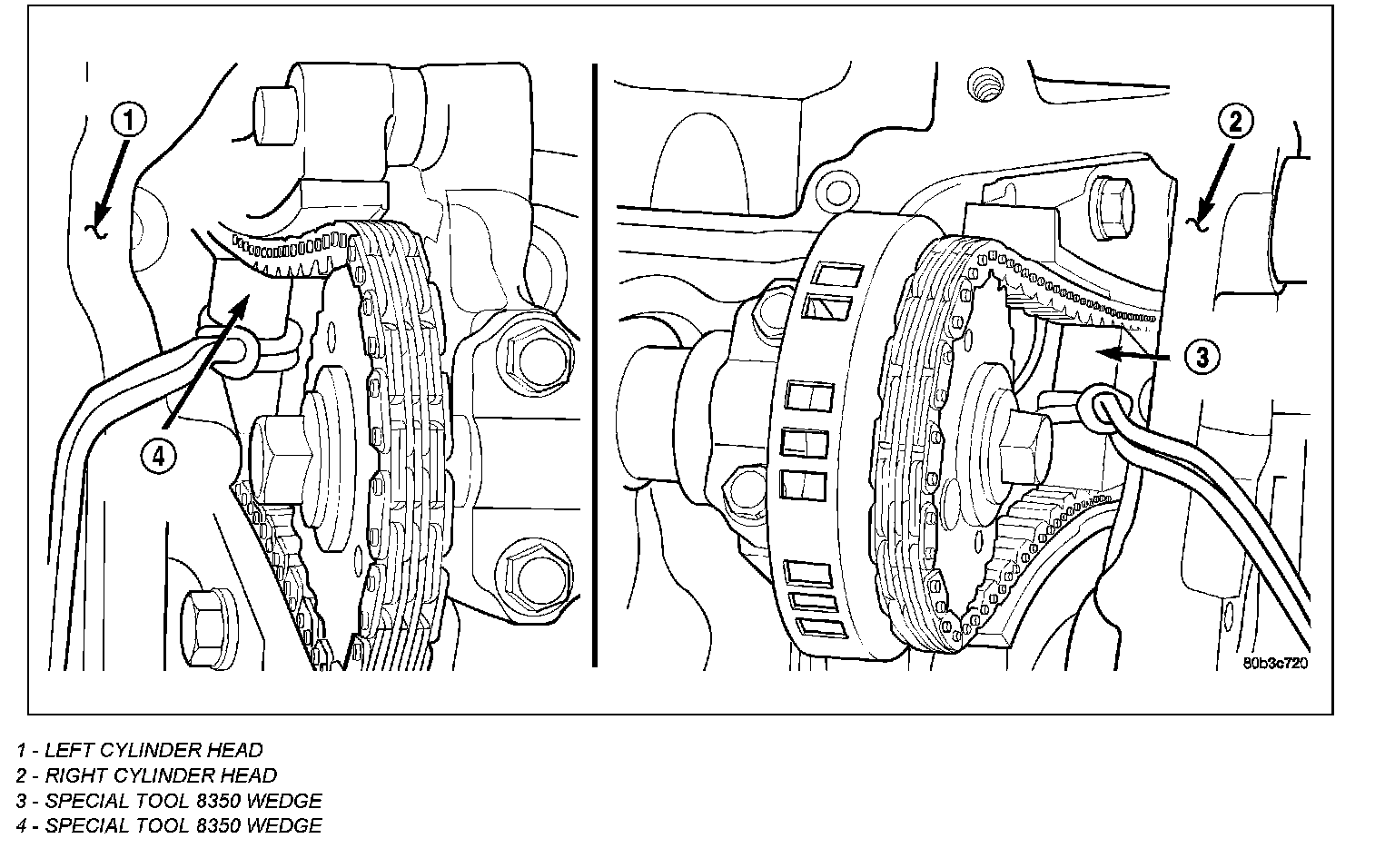 1. Using Chain Tensioner Wedge, special tool 8350 (3), stabilize the secondary chain drive. For reference purposes, mark the chain-to-sprocket position.