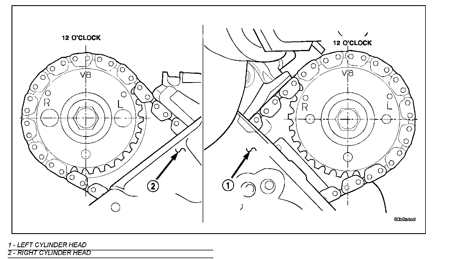 4. Re-index the camshaft drive gear in the chain until the V8 mark is at the same position as the V8 mark on the opposite camshaft drive gear.