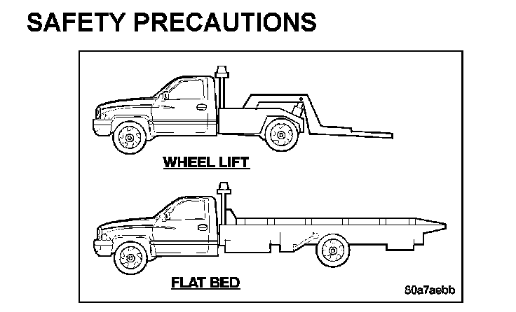 CAUTION: Many vehicles are equipped with air dams, spoilers, and/or ground effect panels. To avoid component damage, a wheel-lift towing vehicle or a flat-bed hauling vehicle is recommended.