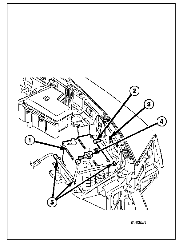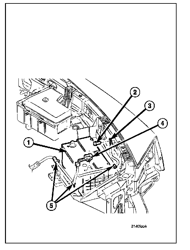 4. One at a time, trace the battery cable retaining pushpins (5), fasteners and routing clips until the cable is free from the vehicle.