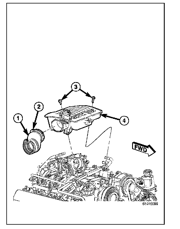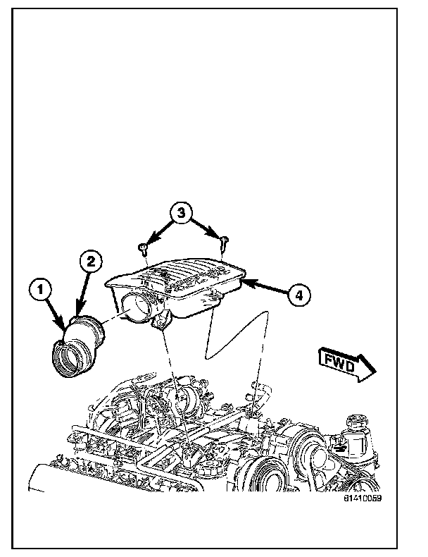 11. Position the resonator (4) into the vehicle. Install the bolts (3) into the air intake resonator (4) and tighten the band clamp (2) on the air inlet tube (1).