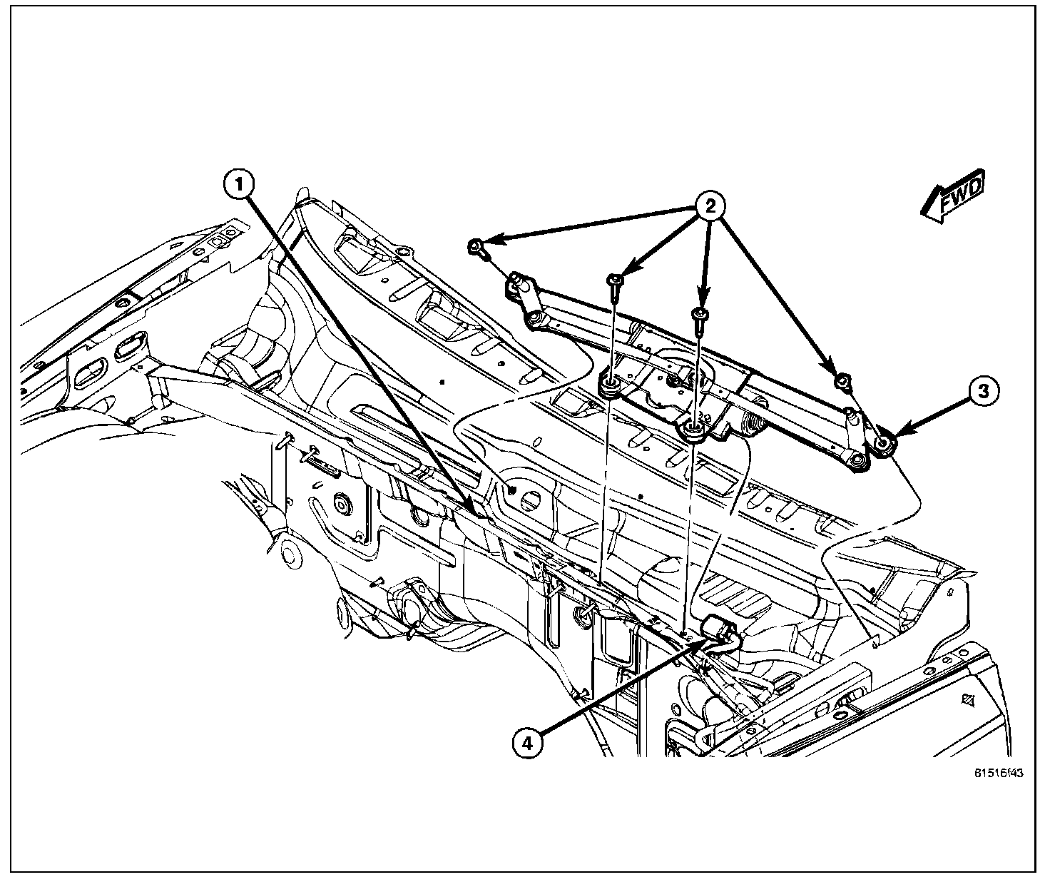 5. Remove the four screws (2) that secure the wiper module (3) to the cowl plenum panel.