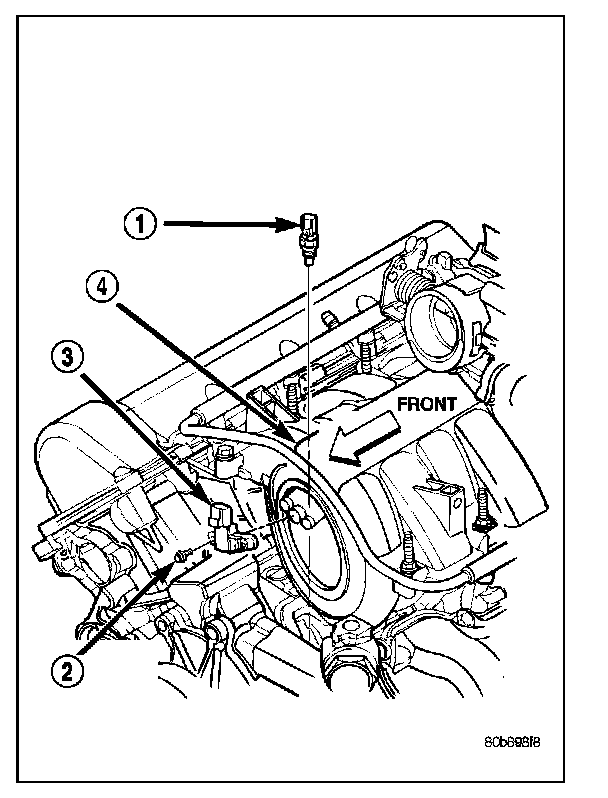The MAP sensor (3) is located on the front of the intake manifold. An O-ring seals the sensor to the intake manifold.
