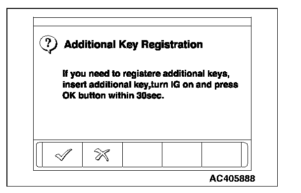 9. When the ignition key registration is finished, the additional key registration menu is displayed. To register the additional key, insert the key and turn the ignition switch to the "ON" position. Then, press the OK button. Press the CANCEL button to terminate the ignition key registration.