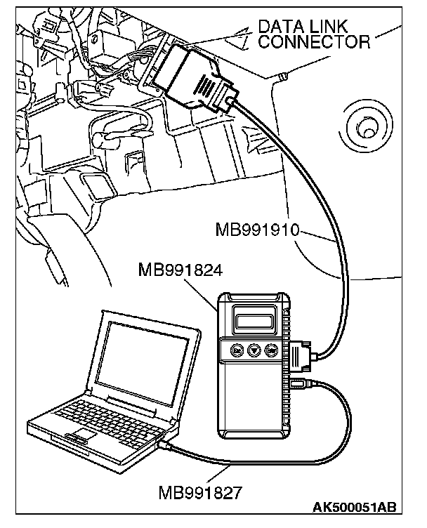 NOTE: Disconnecting the scan tool MB991958 is the reverse of the connecting sequence, making sure that the ignition switch is at the "LOCK" (OFF) position.