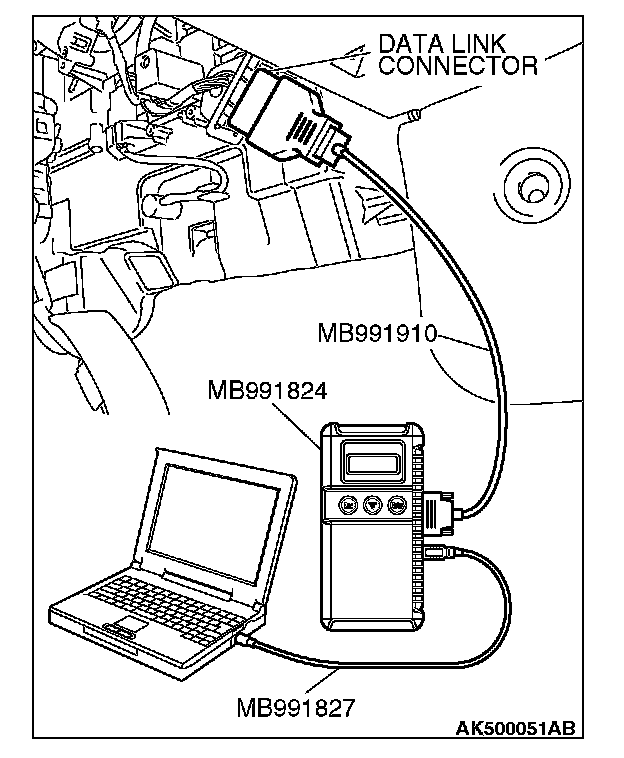 CAUTION: To prevent damage to scan tool MB991958, always turn the ignition switch to the "LOCK" (OFF) position before connecting or disconnecting scan tool MB991958.