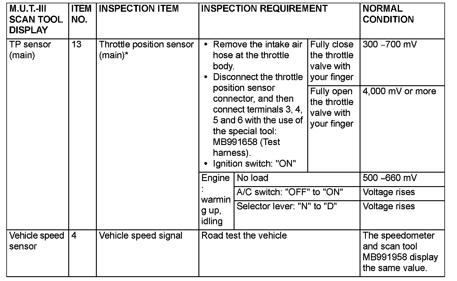 NOTE: *:After the inspection is completed, disconnect the throttle position sensor connector, and then delete the diagnostic trouble code using use of scan tool MB991958. Scan Tool Connecting