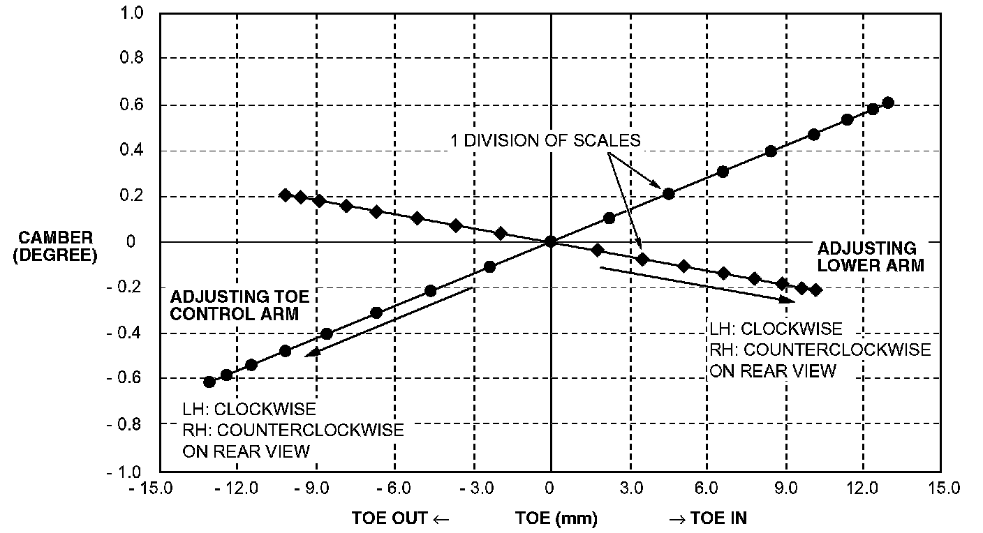 ^ If either of camber or toe is adjusted, both should fluctuate. For the relationship between the two, refer to CAMBER AND TOE REFERENCE TABLE.