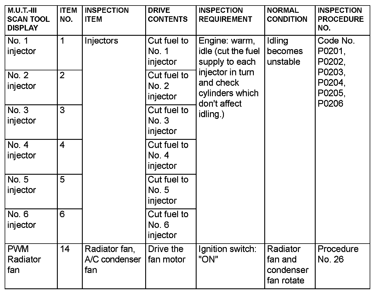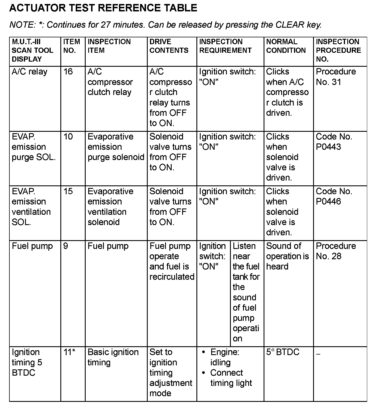 Actuator Test Reference Table (Part 1):