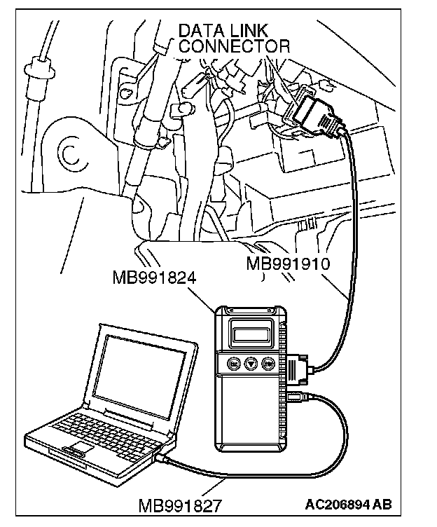 CAUTION: To prevent damage to scan tool MB991958, always turn the ignition switch to the "LOCK" (OFF) position before connecting or disconnecting scan tool MB991958.