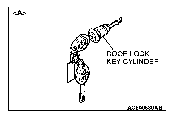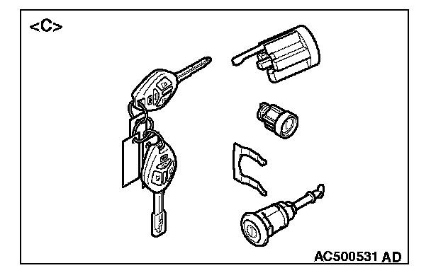 - Do not register the ignition keys other than the ignition key that starts the engine. (When replacing by the door lock key cylinder of illustration [A] or the glove box lid lock cylinder of illustration [b], the engine cannot start if the encrypted code is registered with the bar code on the ignition key supplied simultaneously. If the ignition key using for each lock cylinder and starting engine is used as a common ignition key, replace by the key set of illustration [C].)