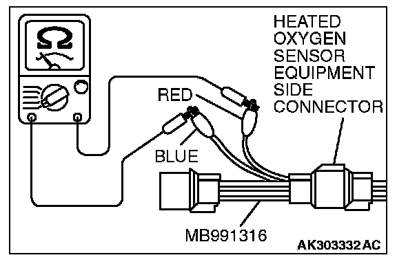 2. Make sure that there is continuity [4.5 - 8.0 ohms at 20 °C (68 °F)] between terminal No. 1 (red clip) and terminal No. 3 (blue clip) on the heated oxygen sensor connector.